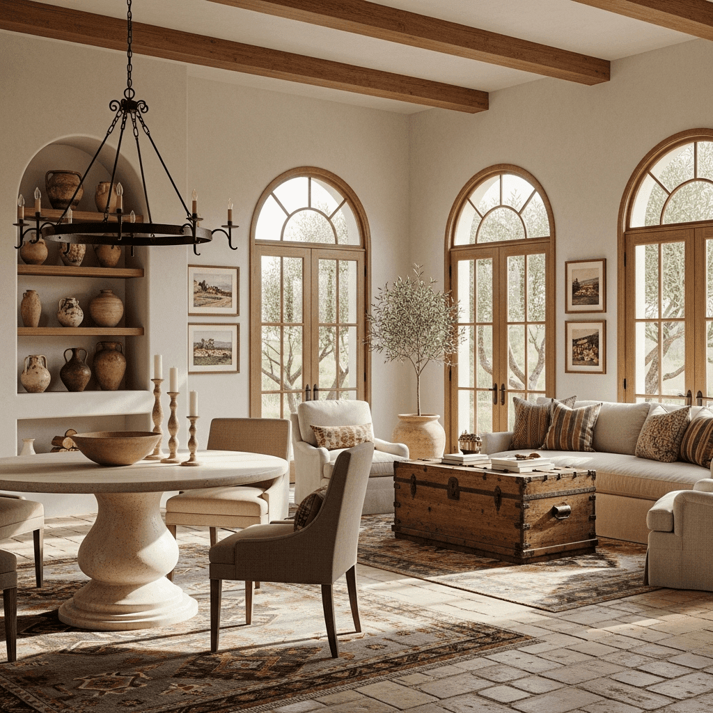 1. Travertine Stone Pedestal: A porous, earthy stone table that brings a “warm-neutral” aesthetic.