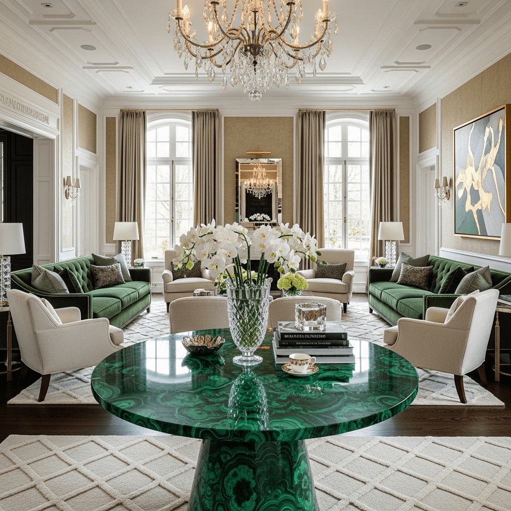 1. Emerald Malachite Inlay: A bold, green patterned stone that acts as a room’s jewel.