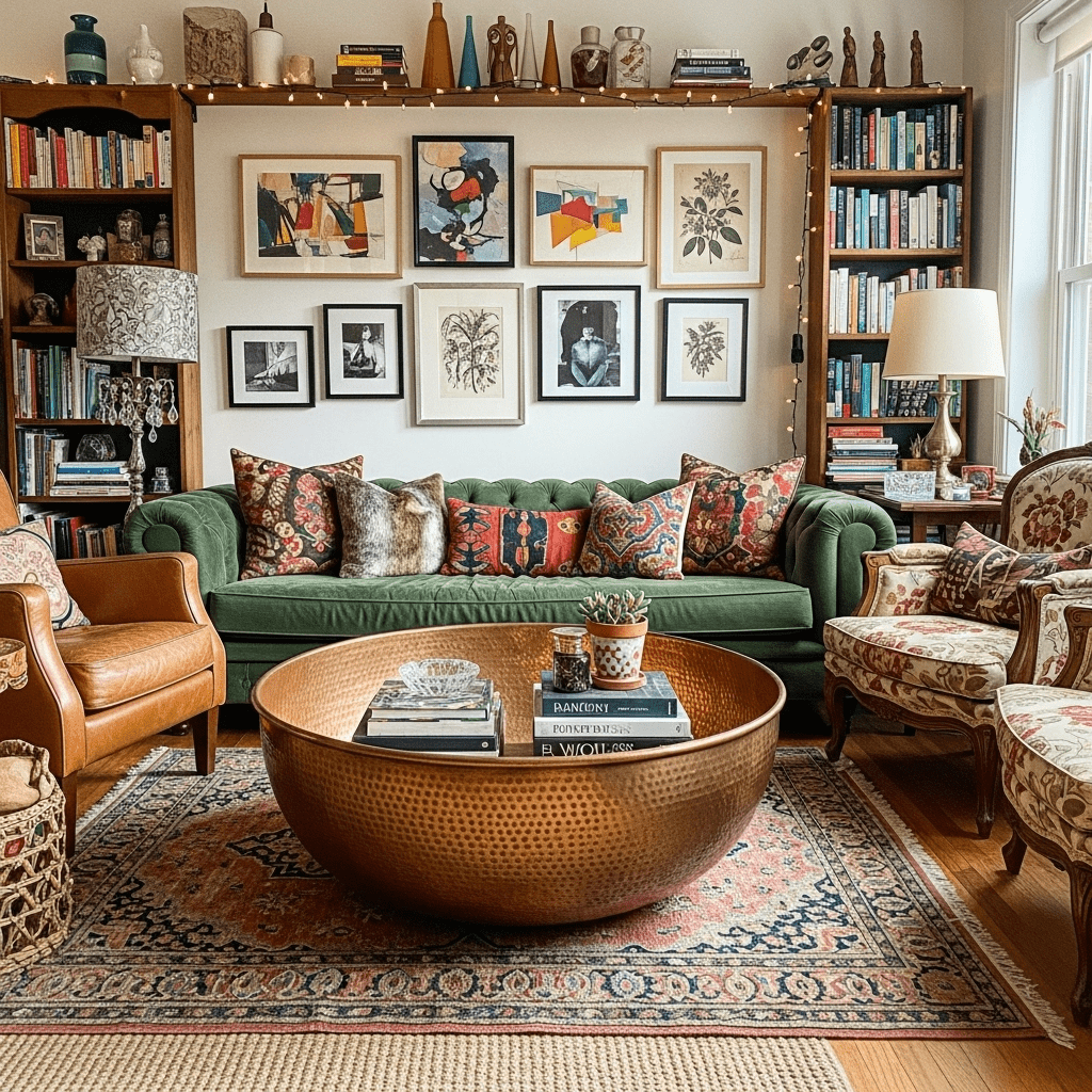 1. Copper Hammered Bowl: A metallic, rounded table with a hand-crafted, textured surface.