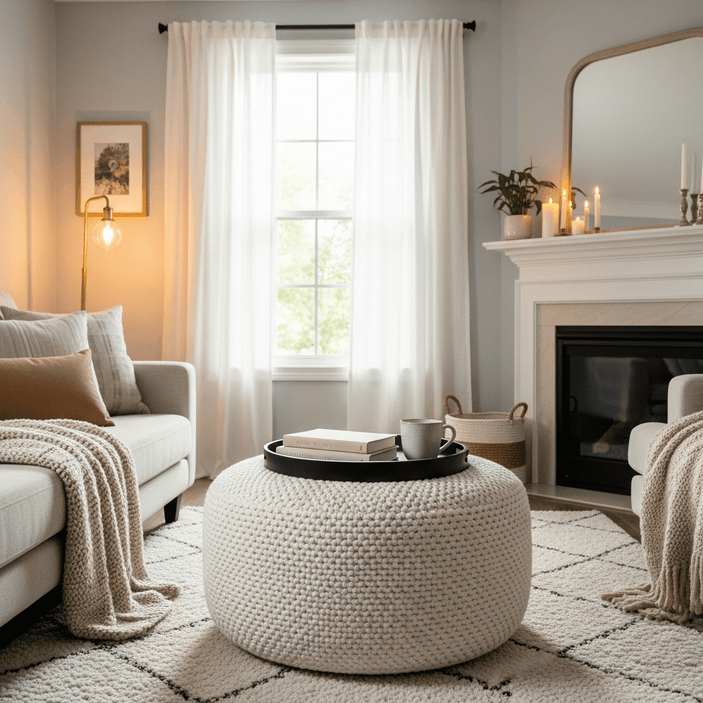 1. Bouclé Ottoman with Tray: A soft seating piece that doubles as a table with a steady tray.
