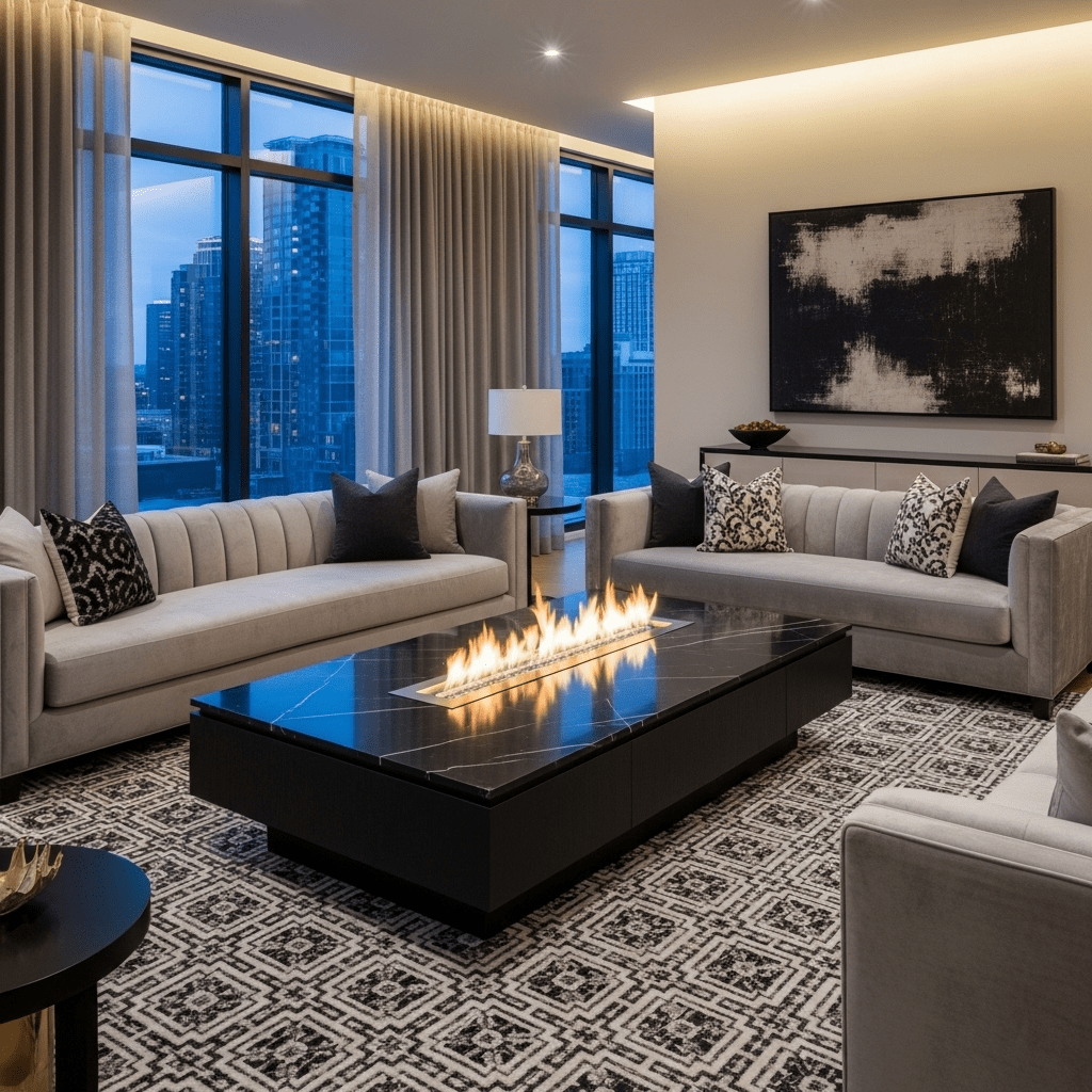 1. Fire Pit Table (Indoor/Bio-ethanol): A center table with a safe, built-in flame feature.