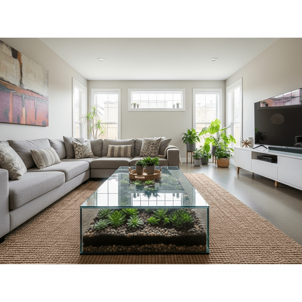 1. Terrarium Display Table: A glass-enclosed table that houses a miniature indoor garden.