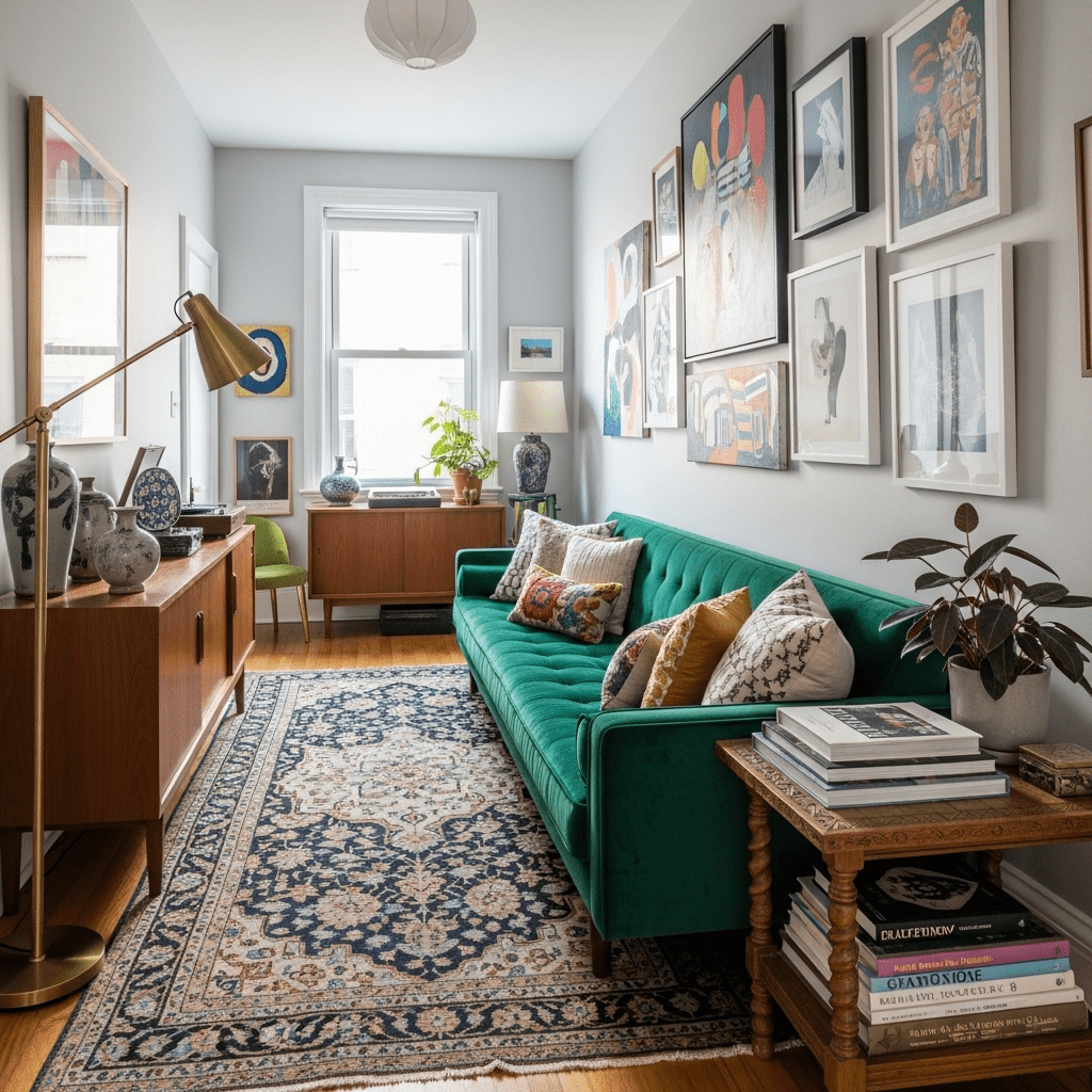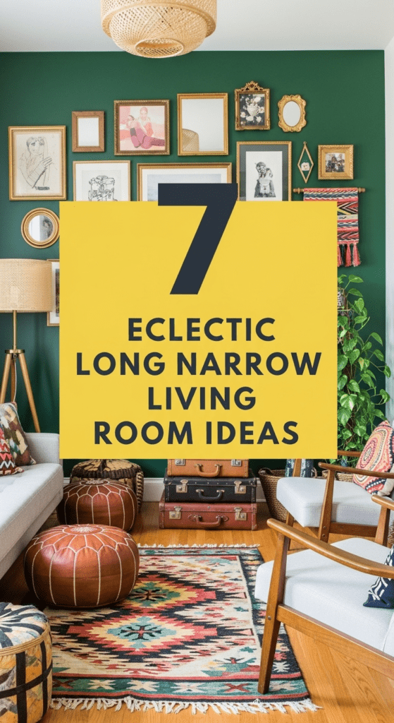 Eclectic design transforms narrow living rooms into unique, personality-filled spaces that celebrate individuality and creative mixing!