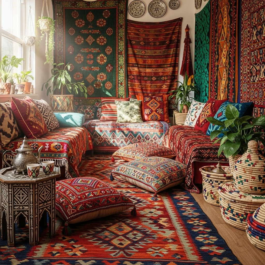 Layer patterns from different cultures—Moroccan, Turkish, Indian, Mexican—throughout the space.