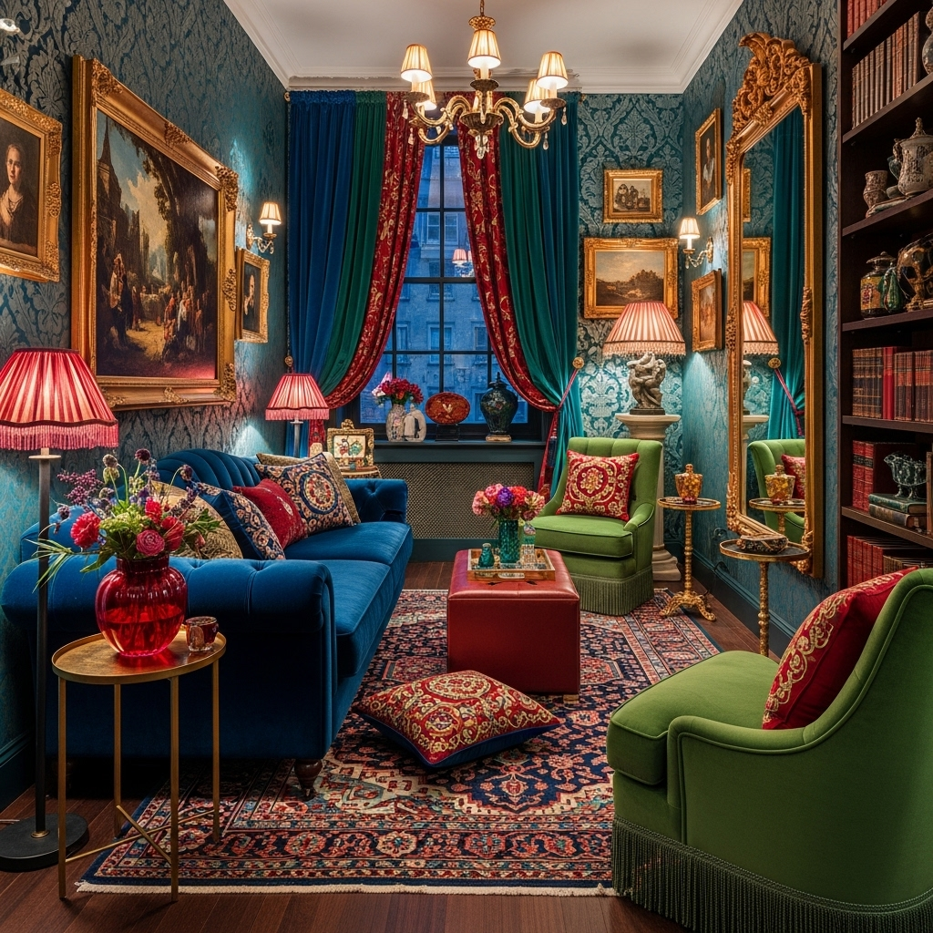 Use sapphire blue sofa, emerald accent chair, ruby pillows, and amethyst artwork. The saturated colors create luxurious eclectic drama. Add gold and brass accents throughout.