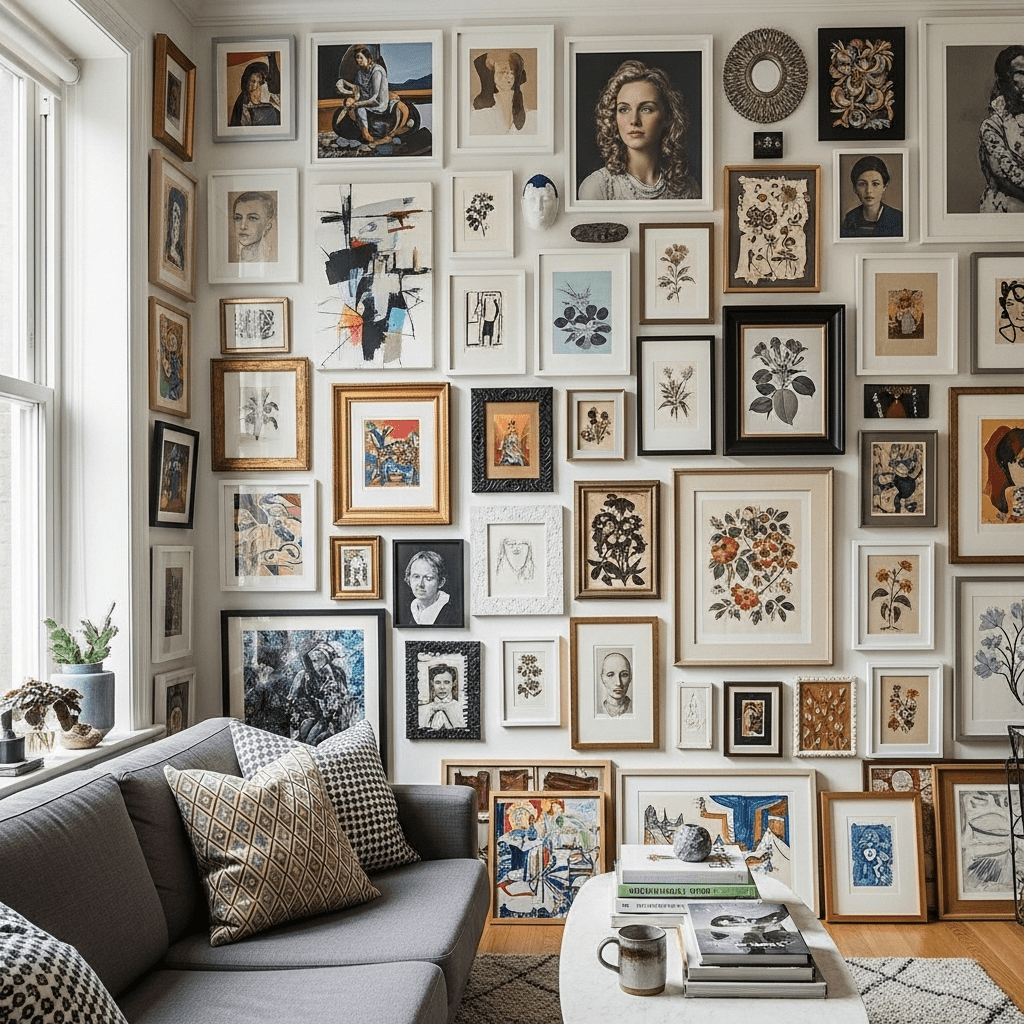 Hang abstract art next to vintage prints, photography beside paintings, varied frames from ornate gold to simple black. The dense gallery creates personality. Keep furniture neutral to let art shine.