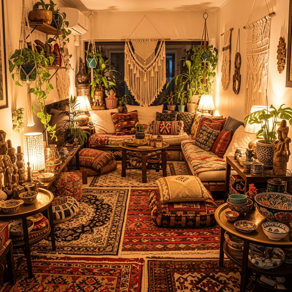Layer multiple rugs, pile pillows in various patterns, add macramé wall hangings, fill with plants, display collections. The abundant layering creates warm eclectic sanctuary.