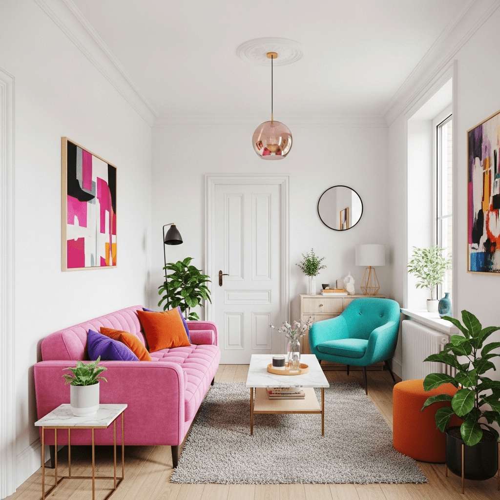 Combine pink with orange, teal with burgundy, or yellow with purple. The bold color mixing creates confident eclectic personality. Balance with neutral backdrop and varied textures.