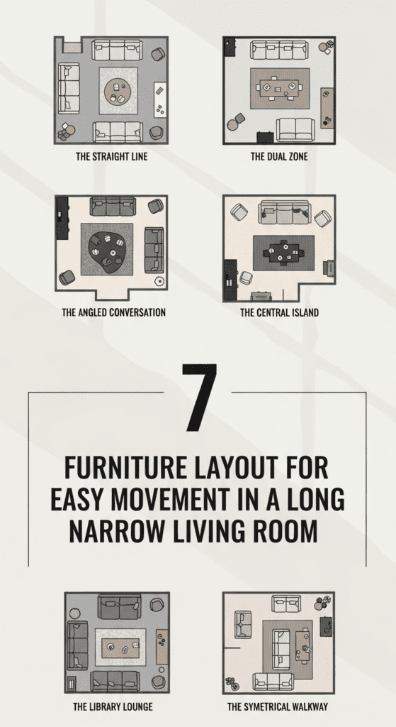 Mastering the Flow: The ultimate goal is to move through your living room with ease, not strategy. Start by identifying your non-negotiable walkway, then experiment with these layouts using paper cutouts or digital room planners before moving a single heavy piece. Remember, in a long narrow living room, the space you leave open is just as important as the furniture you place.