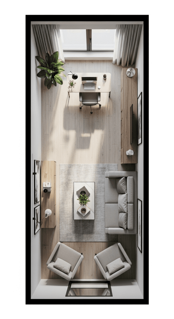 Divide the room into two distinct zones: perhaps a seating area near the entrance and a reading or workspace at the far end. Use a slim console table, a low bookcase, or even a change in rug to subtly separate the spaces without building a wall.