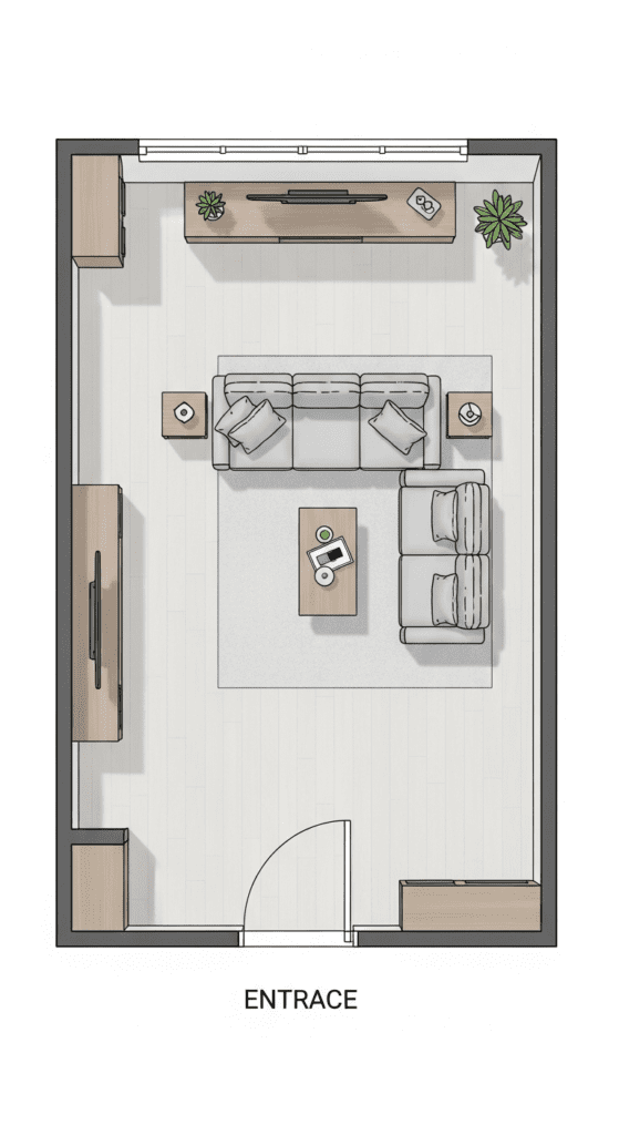 This advanced layout is excellent for rooms that must handle high traffic or connect to another space, like a dining area.