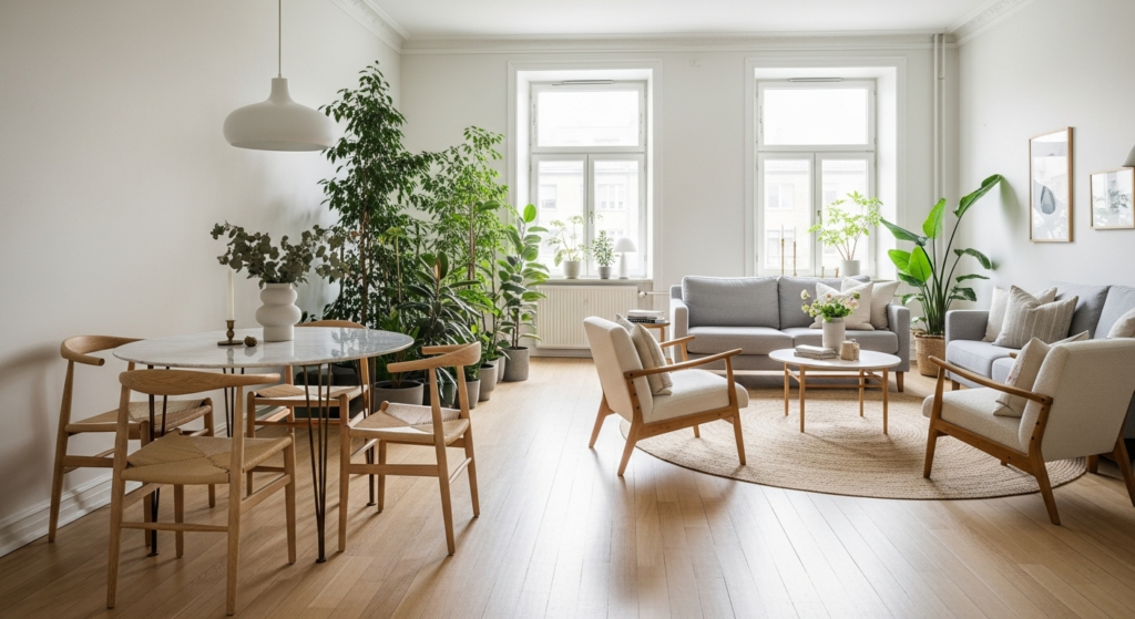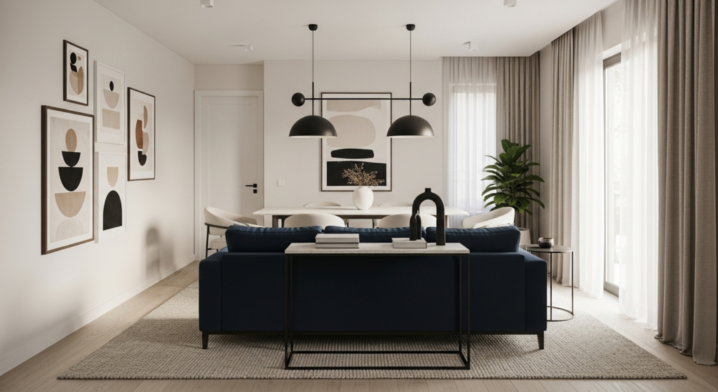 Pull your furniture away from the walls to create intimate, defined zones within the larger space. Float the dining table in the center of one section and arrange living room seating as a cozy conversation area in another section. This counterintuitive approach actually makes narrow rooms feel wider and more dynamic.