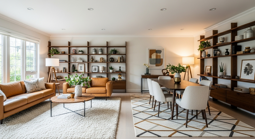 Use area rugs to visually separate your living and dining zones without physical barriers. Choose complementary rugs in different sizes or styles—one under the seating area and another beneath the dining table. This technique creates definition while allowing the space to feel cohesive and flowing.