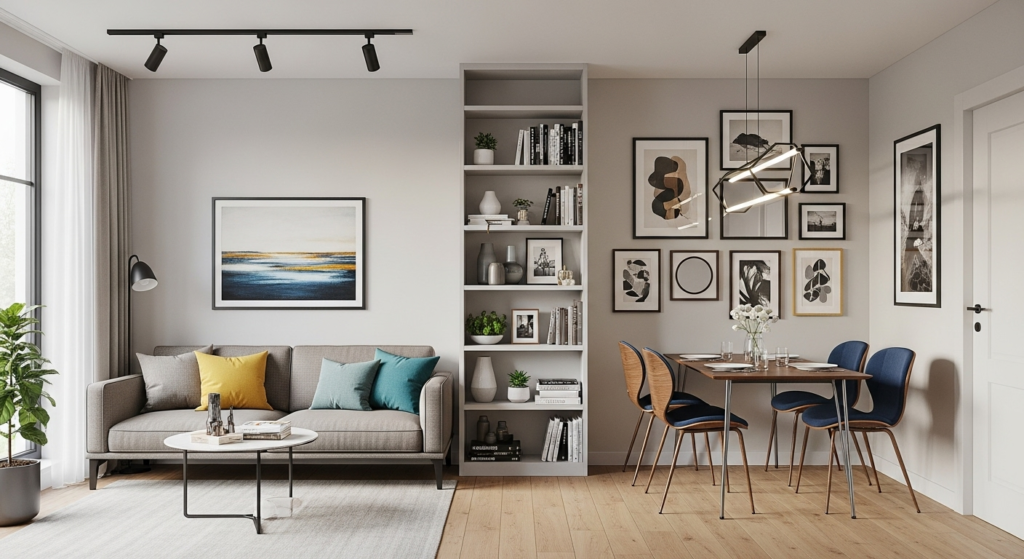 Create a transitional zone between living and dining areas using multi-functional furniture. A narrow bookshelf, bar cart, or plant stand positioned between the two spaces provides storage while subtly marking the boundary. This approach works particularly well in extremely narrow rooms where every inch counts.