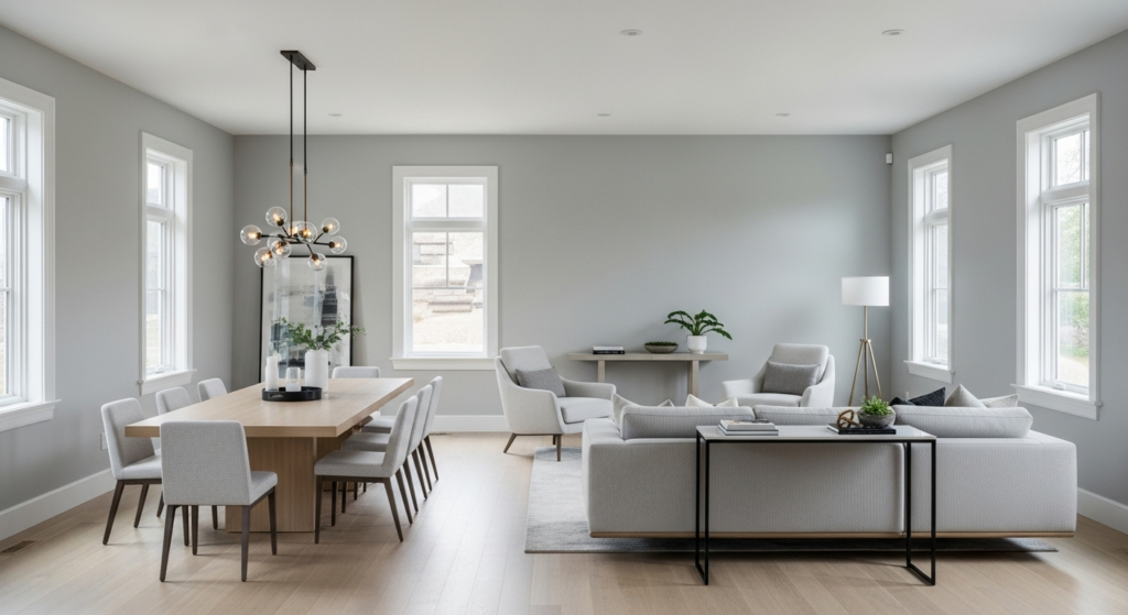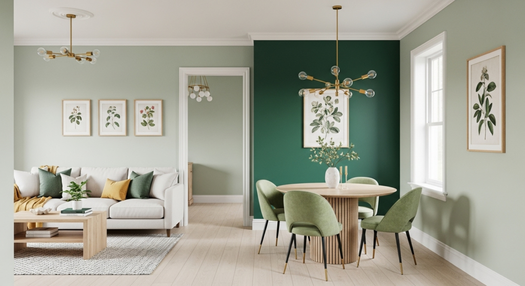Use paint, wallpaper, or different wall treatments to visually separate your living and dining areas. Paint the dining end in a deeper or contrasting color while keeping the living area lighter, or use an accent wall to create distinct zones. This architectural approach adds depth and prevents the space from feeling monotonous.