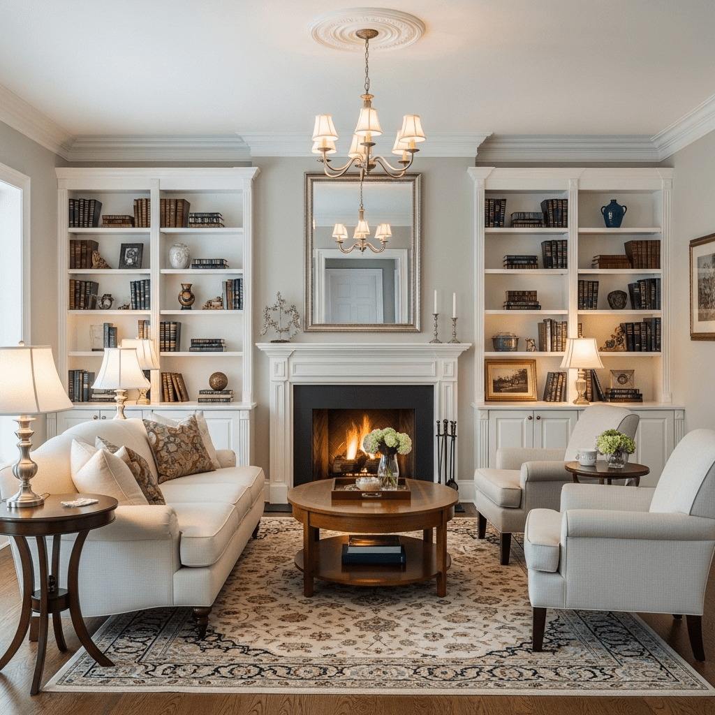 Install built-in bookcases or place matching furniture on both sides of fireplace. Position sofa centered facing the fire with balanced elements. The symmetry creates formal elegance and frames the fireplace beautifully.