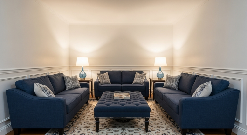 Create Conversation Zones: Arrange seating so people can comfortably converse without shouting across the room. Ideal conversation distance is 4-8 feet between seating pieces. In narrow rooms, this often means perpendicular or angled arrangements work better than parallel.