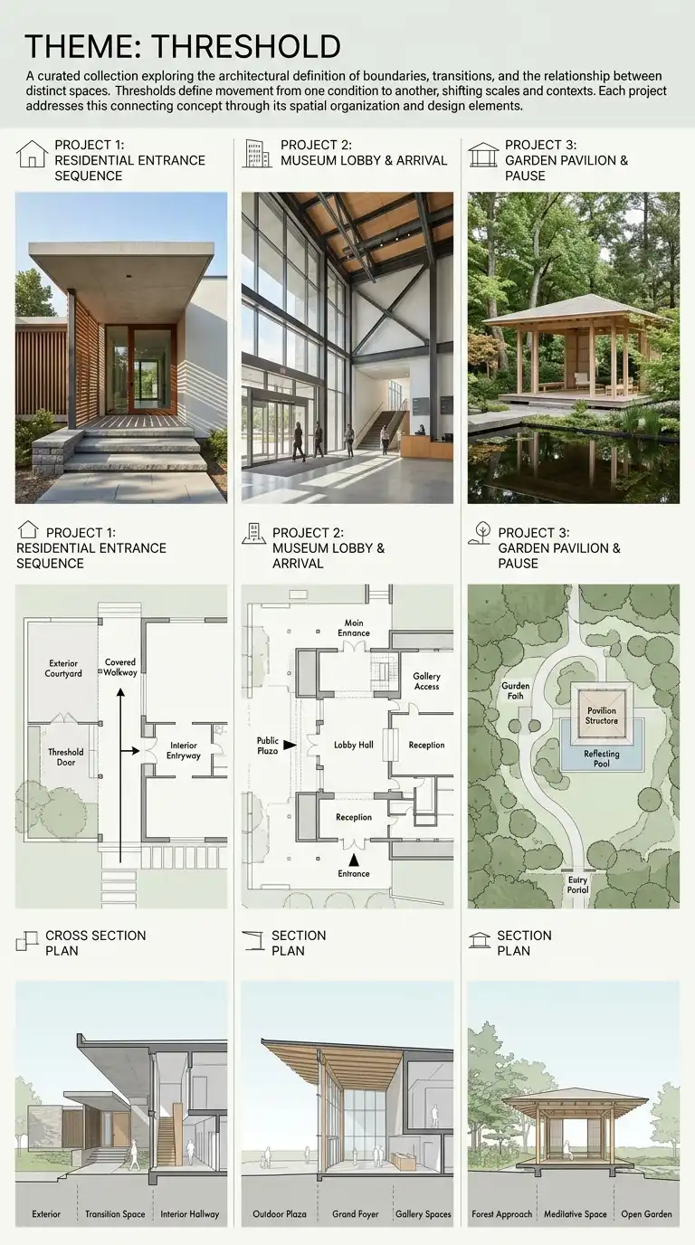 This structure demonstrates conceptual depth. It shows that you think about architecture as more than just problem-solving — that you understand the poetic, experiential, and cultural dimensions of the discipline. Choose a narrative thread that genuinely connects your work. Do not force unrelated projects into a theme just for the sake of cohesion.