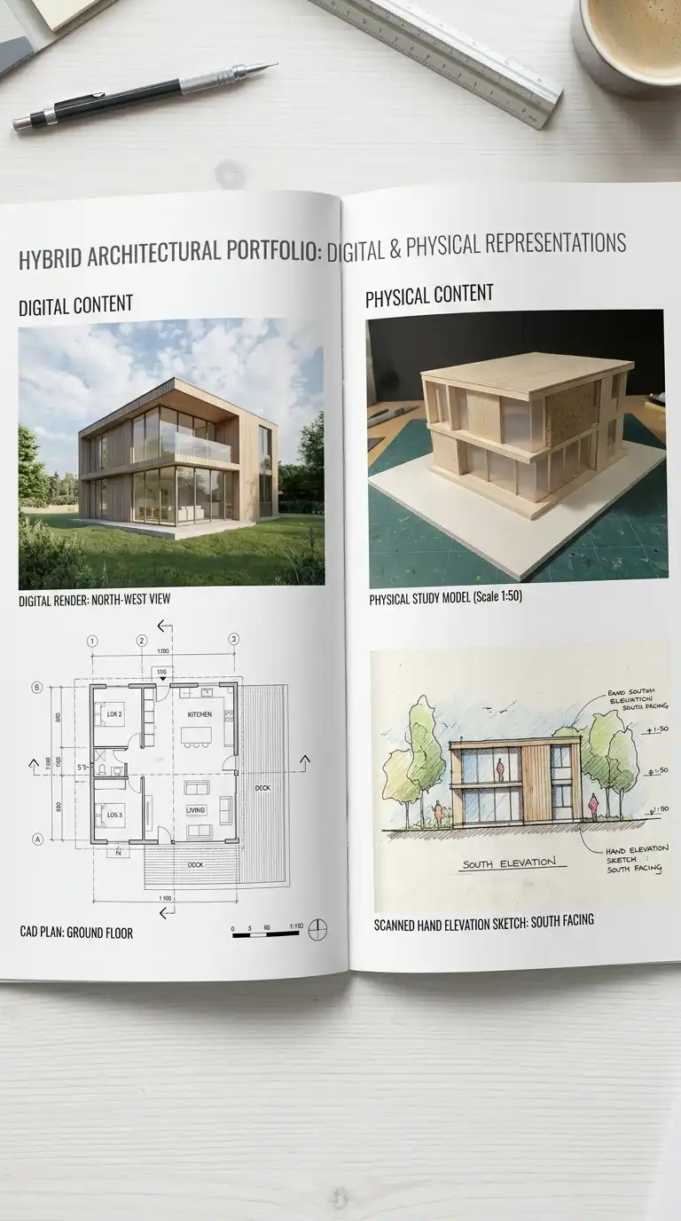 Architecture exists in the physical world, but most portfolios exist entirely on screens. The hybrid physical-digital portfolio acknowledges this contradiction by including photographs of physical models, material samples, and hand drawings alongside digital renderings and CAD drawings.
