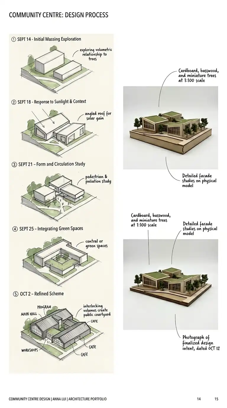 This approach demonstrates how you think, not just what you produced. Include scans of your conceptual massing sketches, photographs of physical study models at 1:100 or 1:200 scale, and side-by-side comparisons of three or four early options before showing the final scheme. Clients and employers value process because it proves you can explore multiple solutions, not just the first idea that came to mind.