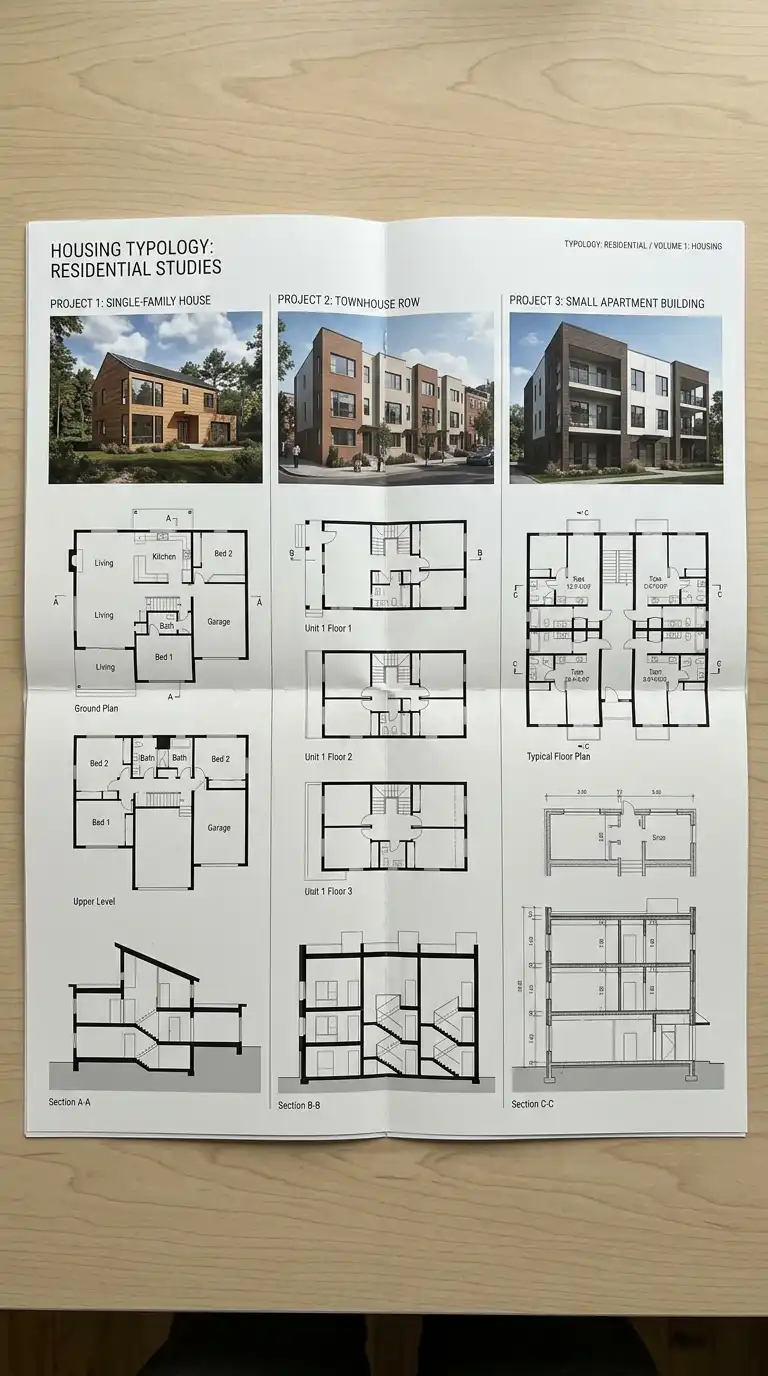 A typology portfolio organises work by building type: houses, schools, museums, offices, public spaces. This structure is traditional but effective, especially when applying to firms that specialise in a particular typology. A residential firm wants to see houses. A museum practice wants to see cultural projects.