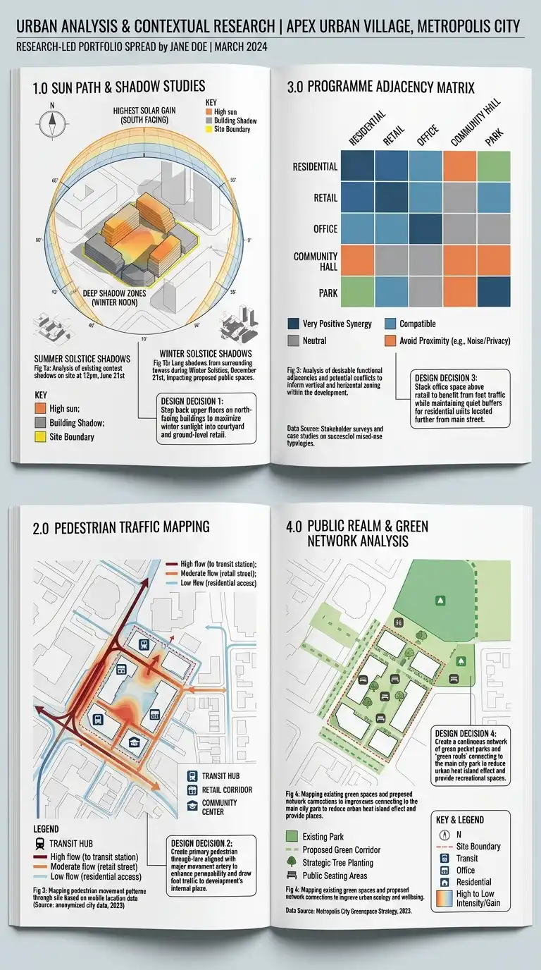 This portfolio type proves you can think critically about architecture, not just produce it. Include diagrams showing daylight studies, wind analysis, pedestrian traffic mapping, or programme adjacency matrices. Show how research directly informed design decisions with annotated diagrams connecting analysis to outcome. For academic portfolios, include a research statement and publication list alongside design work.