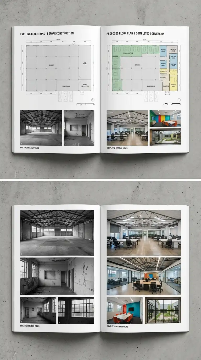 For architects working in renovation, adaptive reuse, or historic preservation, the before-and-after portfolio is the most persuasive format. It shows existing conditions alongside proposed interventions, making the architect’s value immediately visible.