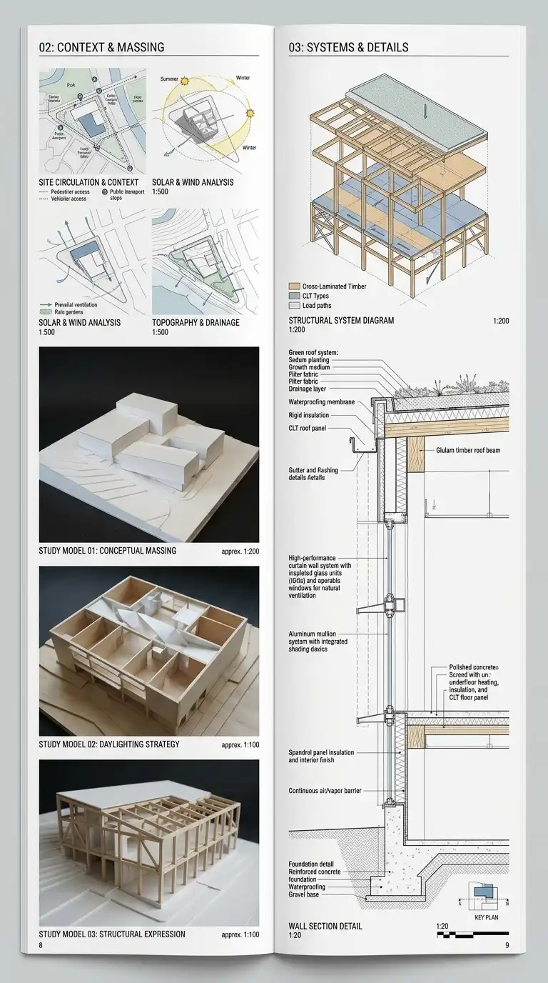 Many architecture portfolios emphasise conceptual design but show little understanding of how buildings are actually built. The construction-focused portfolio does the opposite. It dedicates significant space to wall sections, detail drawings, material specifications, and construction photographs.