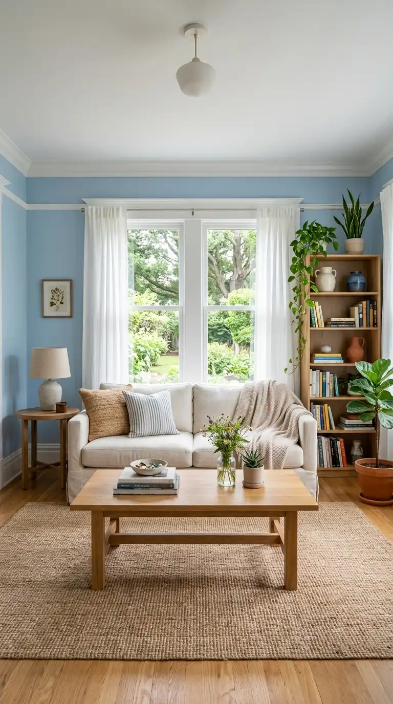 Pairing light blue walls with crisp white trim creates a classic, timeless look that feels clean and airy. The white trim—on baseboards, crown molding, and window frames—adds definition and contrast, while natural wood accents in flooring, coffee tables, and shelving bring warmth and organic texture. White sheer curtains allow natural light to flood the space, enhancing the bright, open atmosphere. This combination is perfect for Scandinavian, coastal, and traditional interiors.
