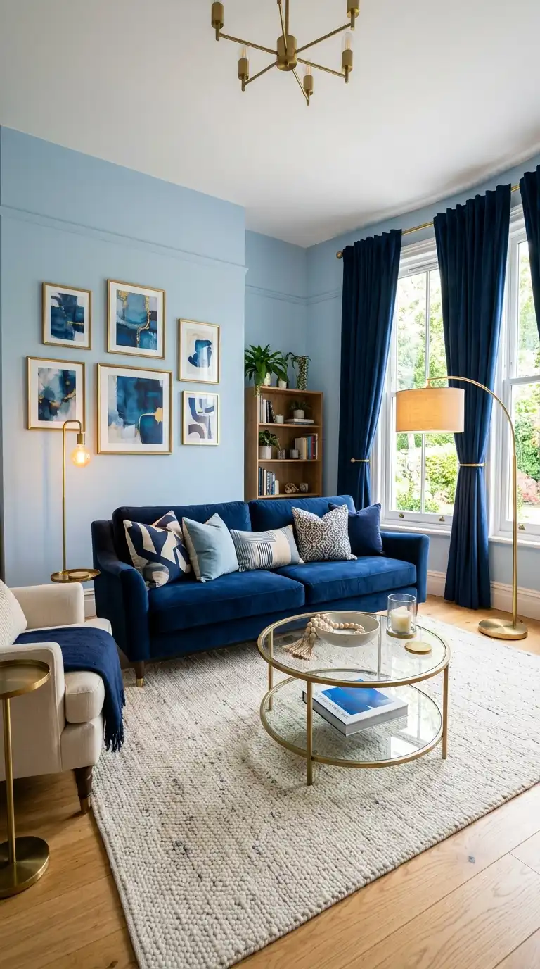Light blue walls provide a soft, serene foundation that allows deeper navy accents to stand out with sophistication. The monochromatic pairing creates depth and visual interest without introducing additional colors. Use navy in a sofa, accent chairs, curtains, or a patterned area rug. Brass or gold accents in lighting and coffee tables add warmth and elevate the overall look.