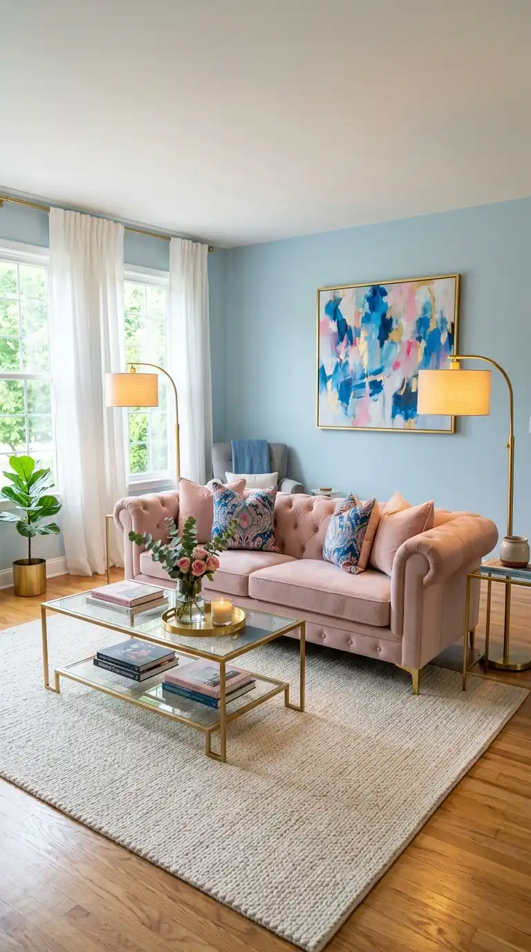 Light blue and blush pink create a soft, romantic palette that feels both modern and timeless. The cool blue balances the warmth of pink, resulting in a space that is gentle, inviting, and effortlessly chic. Introduce blush through throw pillows, a velvet armchair, or artwork, and add gold accents in lighting and coffee tables for warmth and elegance.