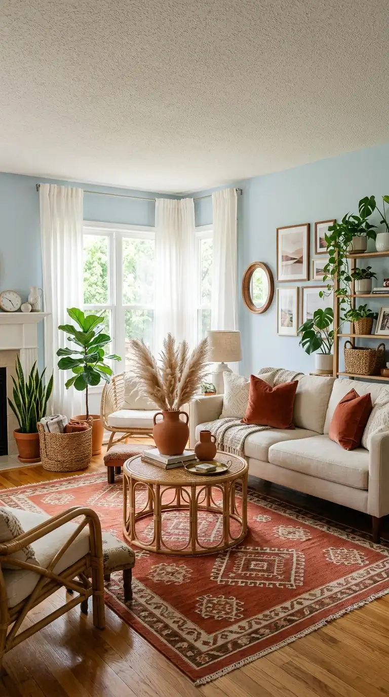 Light blue and terracotta create a warm, earthy palette inspired by Mediterranean landscapes. The cool blue balances the warm, rustic terracotta, while woven textures in jute, rattan, and wicker add organic depth. Introduce terracotta through clay pots, rust-colored pillows, or a terracotta area rug, and use natural wood furniture to enhance the grounded, inviting feel.