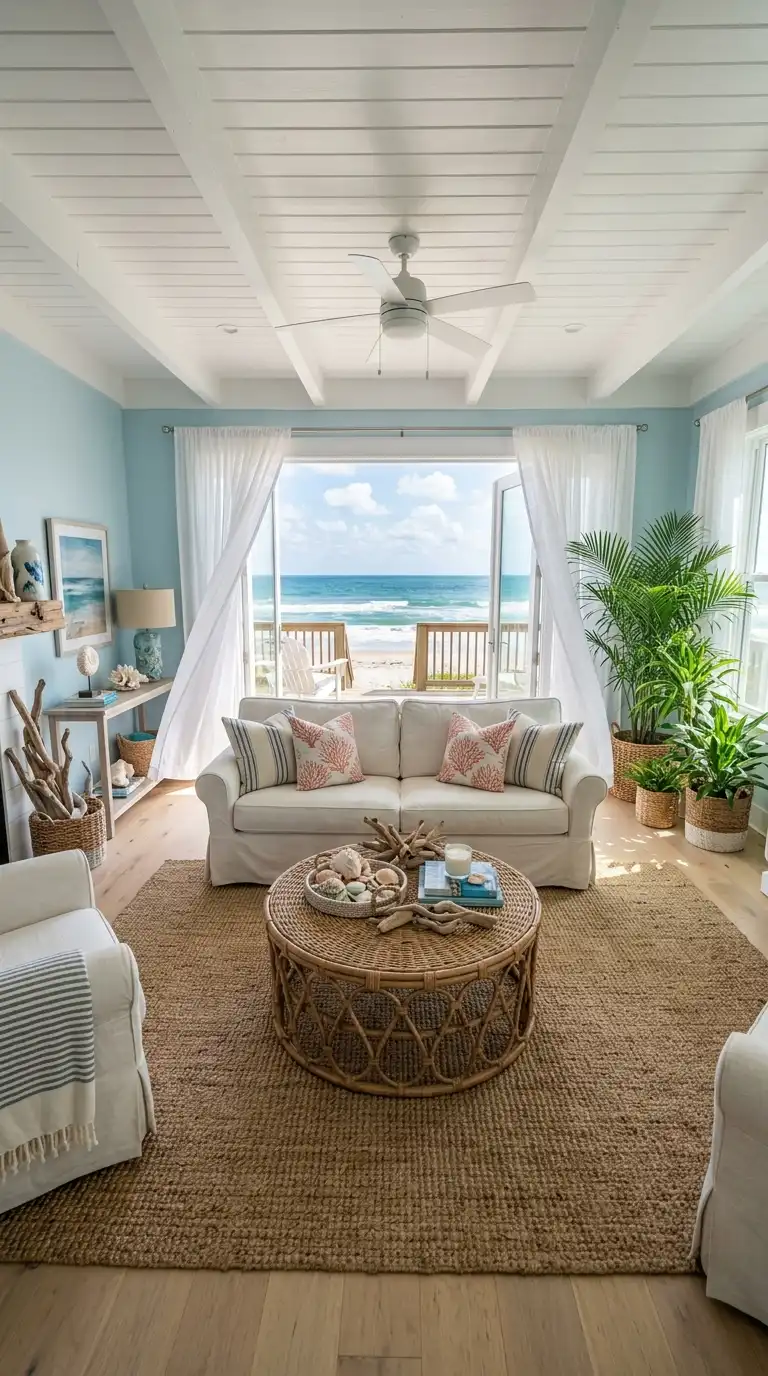 Light blue walls are a natural fit for coastal-inspired interiors. The soft blue evokes the color of a clear sky or calm sea, creating a relaxed, breezy atmosphere. Pair with white slipcovered furniture, rattan accents, and natural textures like jute, linen, and weathered wood. Add woven baskets, driftwood accents, and plenty of greenery to complete the beachy, inviting aesthetic.