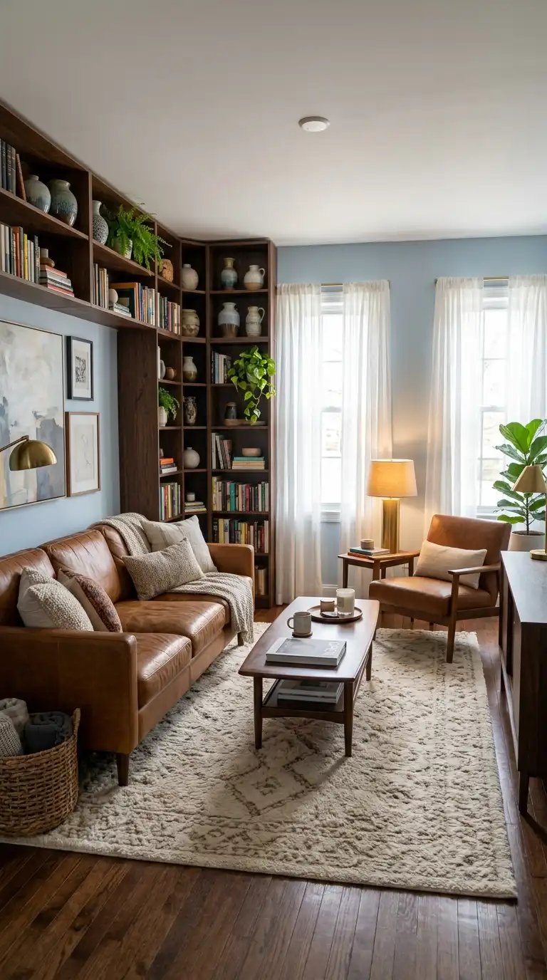 Light blue walls provide a soft, airy backdrop that allows dark wood furniture and leather accents to stand out with warmth and richness. Use a walnut coffee table, dark wood shelving, or a leather armchair to add depth and contrast. The combination feels grounded, sophisticated, and inviting—perfect for traditional or transitional spaces.
