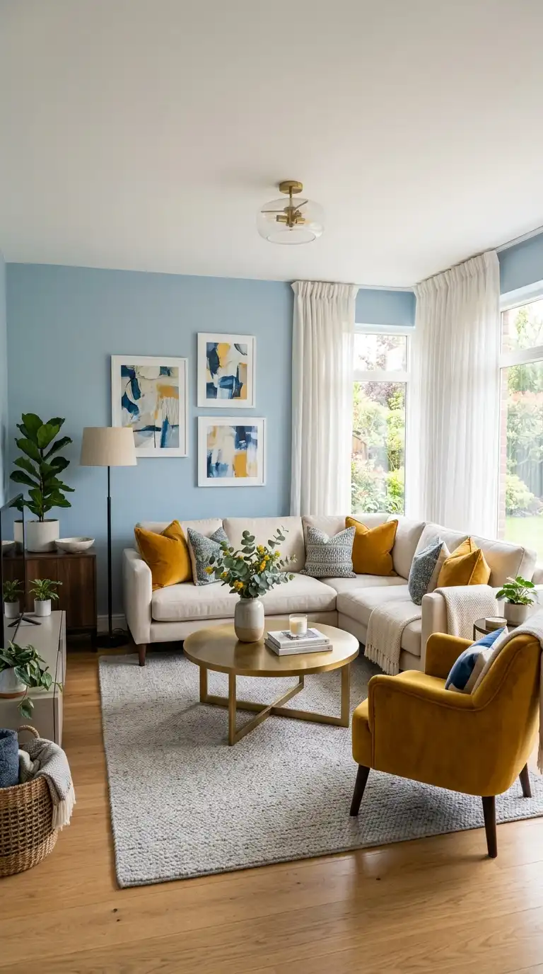 Light blue and warm yellow create a cheerful, energetic palette that feels fresh and inviting. The cool blue provides a calm foundation while yellow adds warmth and optimism. Introduce yellow through throw pillows, a statement armchair, or artwork, and keep larger furniture pieces neutral in cream or light gray. Brass accents enhance the warmth of the yellow.