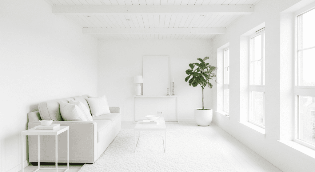 Paint walls, ceiling, and trim in coordinating shades of white—perhaps warm white on walls and crisp white on trim for subtle definition. Choose white or cream upholstered furniture that reflects light rather than absorbing it. Layer in white textiles through curtains, throw pillows, and area rugs, creating a monochromatic palette that feels serene and expansive.