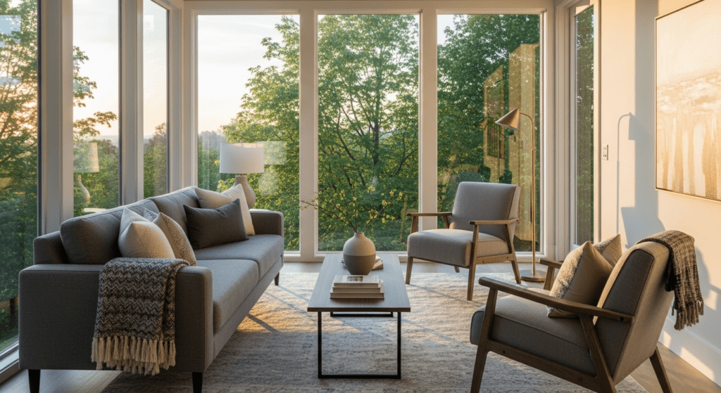 Keep window treatments minimal or use sheer panels that can be drawn back completely during the day. The goal is embracing the windows as a feature rather than covering them. Add task lighting through floor lamps and table lamps positioned around the seating area for evening use when natural light fades.