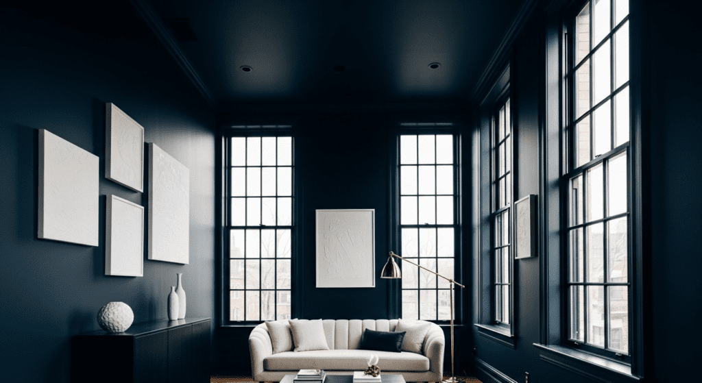 This design direction works particularly well in urban settings where you want to create a bold, contemporary aesthetic. The dark walls provide a stunning backdrop for artwork and make furnishings stand out as focal points.