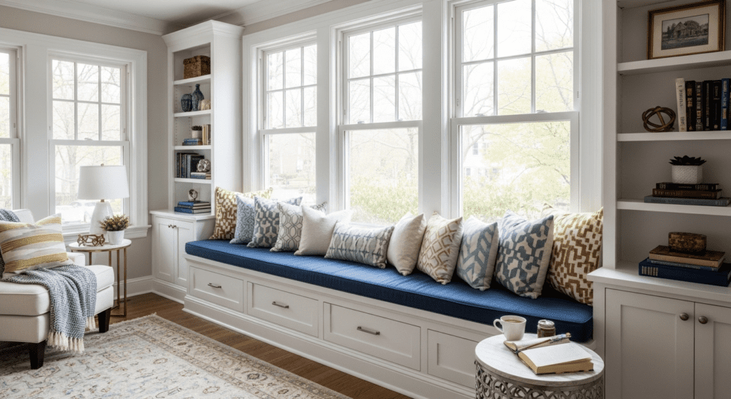 Create a custom window seat along your big windows that provides seating, storage, and a cozy spot to enjoy the natural light and views.
