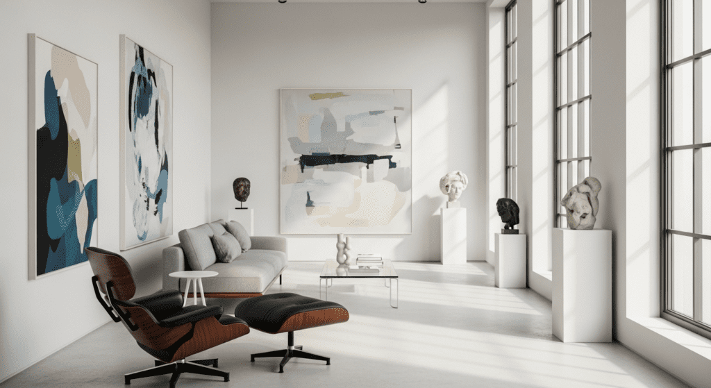 Keep furniture minimal and sculptural—one statement sofa, a sleek coffee table, and perhaps one accent chair. Choose pieces with clean lines and interesting silhouettes that look beautiful when backlit by natural light from the windows. Leave generous negative space around furniture to create the open, breathing room typical of art galleries.