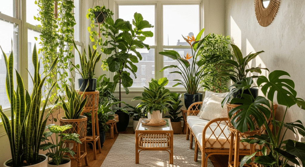 Choose furniture in natural materials—rattan, wicker, wood, linen—that complements the organic feel of the abundant plants. Keep the color palette neutral with whites, creams, and natural wood tones that allow the plants’ green hues to stand out. The big windows provide the intense natural light necessary for a thriving indoor garden.