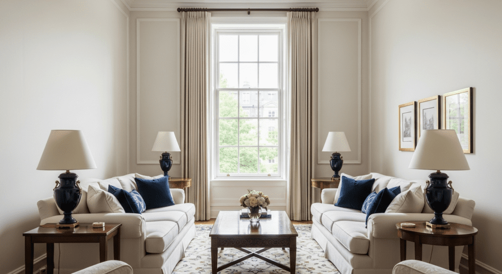 If your windows are centered on one wall, flank them with matching elements—identical table lamps on matching side tables, or twin bookcases on either side. Position a sofa centered in relation to the windows, with matching chairs or loveseats on either side creating perfect symmetry. Add a centered coffee table and centered area rug to reinforce the balanced composition.