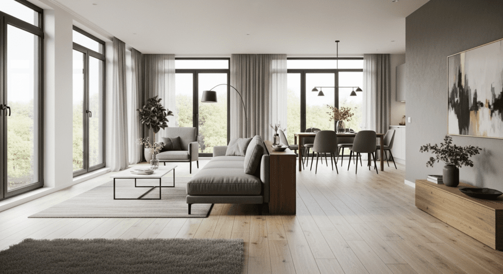 Furniture Placement: Never block your big windows with tall furniture. Position sofas and chairs to enjoy the views and light rather than having your back to the windows. Low-profile furniture works best near big windows.