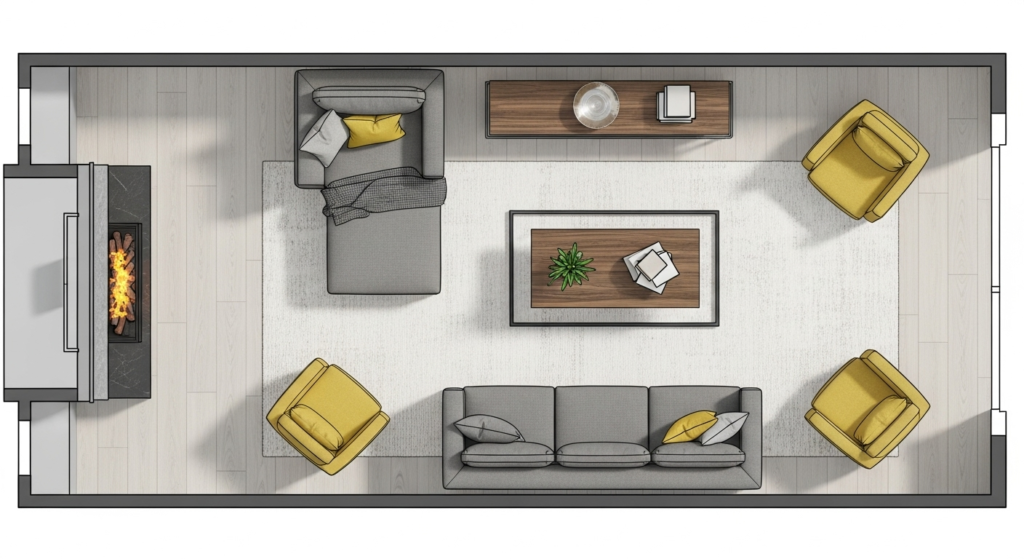 The key to success is treating the fireplace as your primary focal point and arranging furniture to take advantage of its warmth and visual appeal while still addressing the room’s awkward proportions. These nine proven layouts show you how to create comfortable, functional living rooms that celebrate the fireplace without letting narrow dimensions create a bowling alley effect. Each layout offers solutions for different fireplace positions and room configurations.