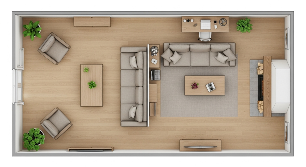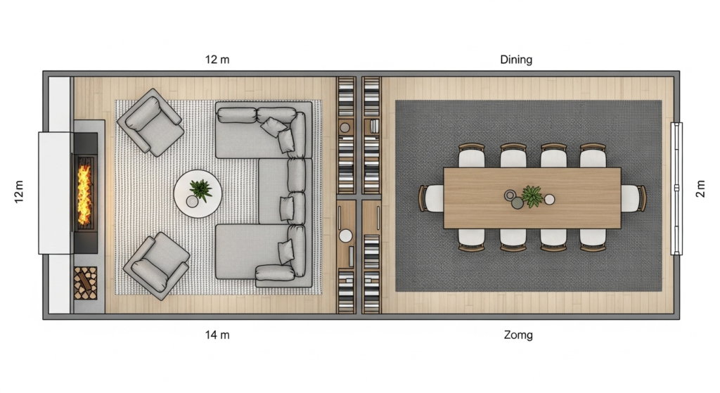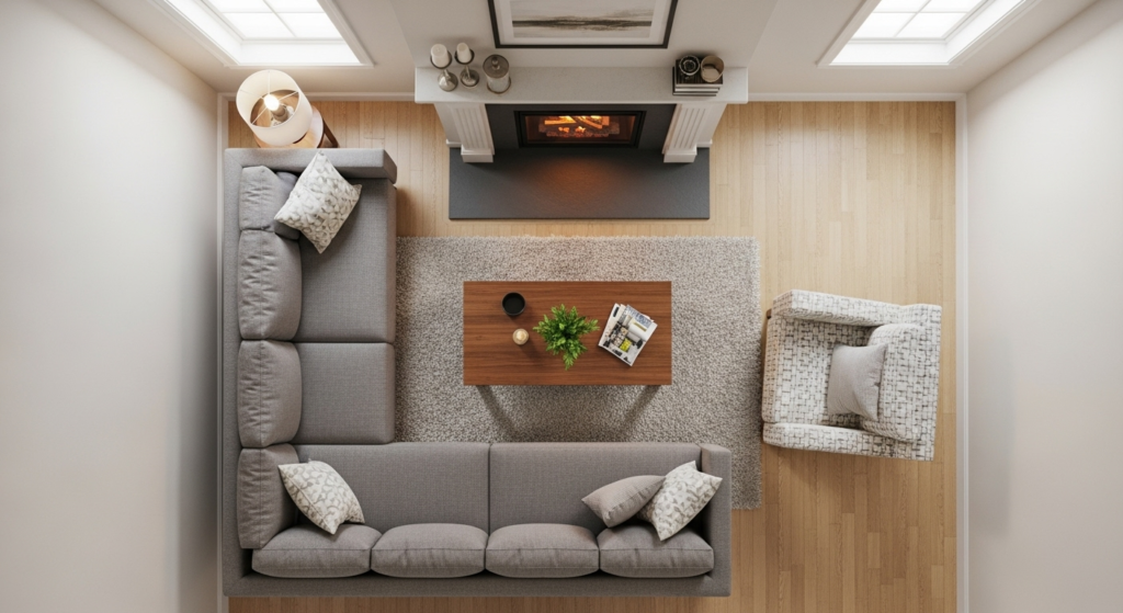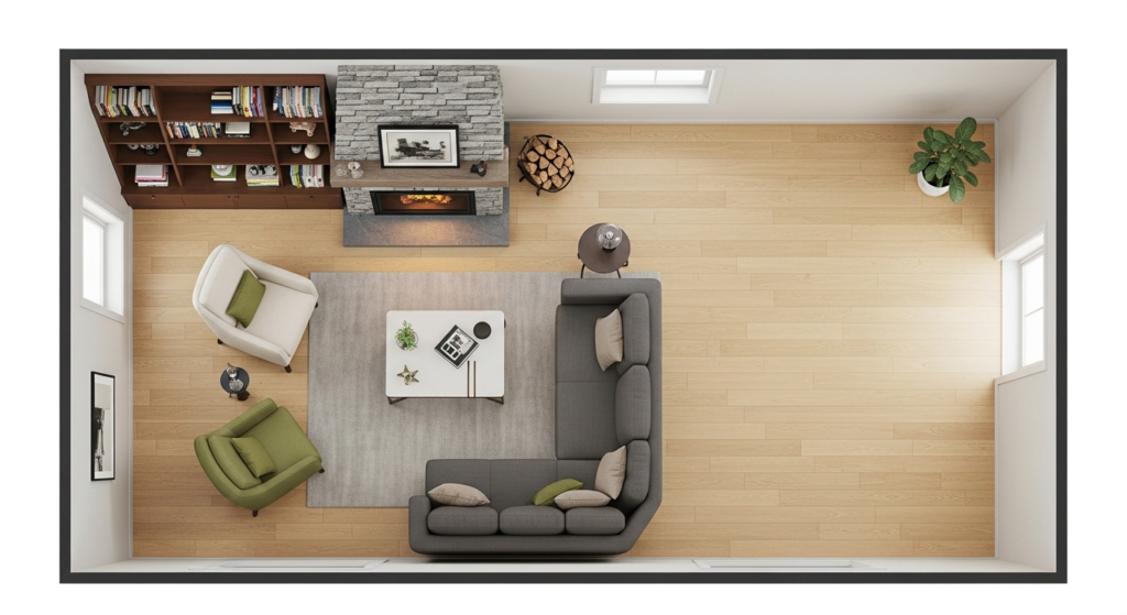 Don’t forget seasonal flexibility. You might push furniture slightly back from the fireplace in summer and pull it closer in winter when you’re using it regularly. Layouts can evolve with seasons and how you use the space. Build in this flexibility from the start.