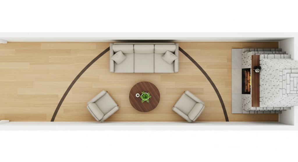Start by accepting your fireplace location. You can’t move it (well, you could, but that’s extremely expensive), so work with where it is. End wall fireplaces are easiest to arrange furniture around in narrow rooms. Long wall fireplaces require more width to work well. Corner fireplaces need creative angled arrangements. Whatever you have, there’s a layout solution that makes it work beautifully.
