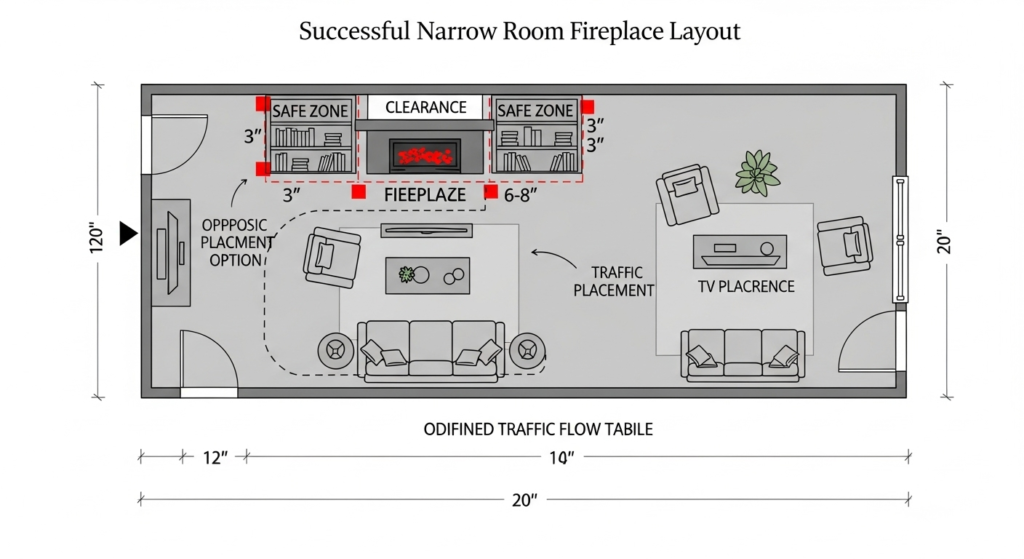 A fireplace should be the heart of your living room—a gathering place that provides warmth, ambiance, and visual focus. In a long narrow room, the fireplace becomes even more important because it gives you a natural focal point to arrange furniture around, preventing the dreaded bowling alley effect.