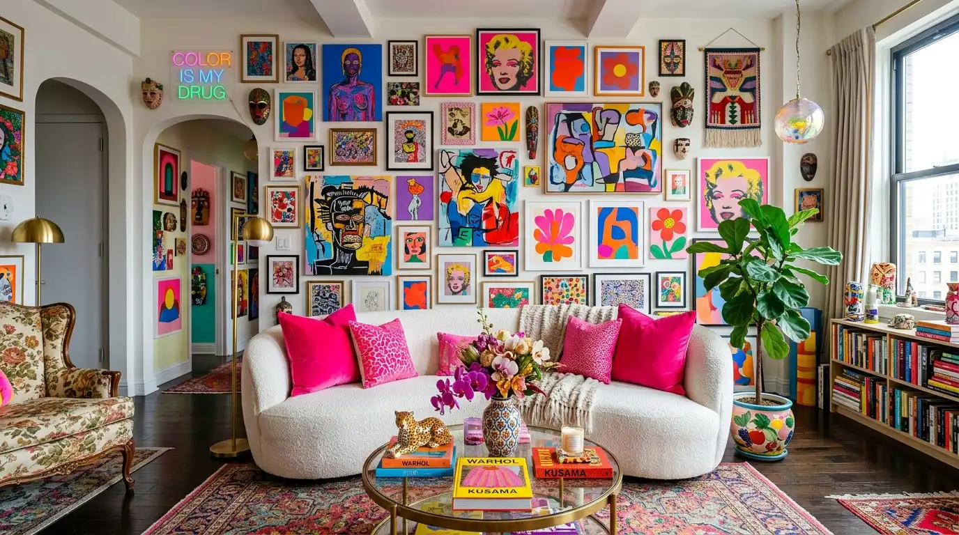 Pair a textured white bouclé sofa with neon-colored acrylic coffee tables and bright pink or lime green throw pillows. The neutral texture of the bouclé adds a sophisticated, “grown-up” balance to the playful, high-energy pops of modern maximalism.