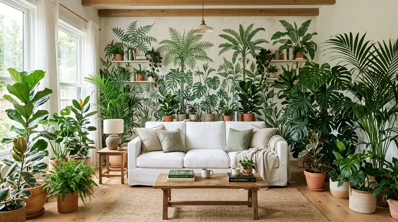 Position a white linen couch in front of a dense wall of oversized tropical plants and floral wallpaper. The white upholstery mimics the look of a bright garden bench, making the greenery and floral patterns feel more vibrant and lifelike.