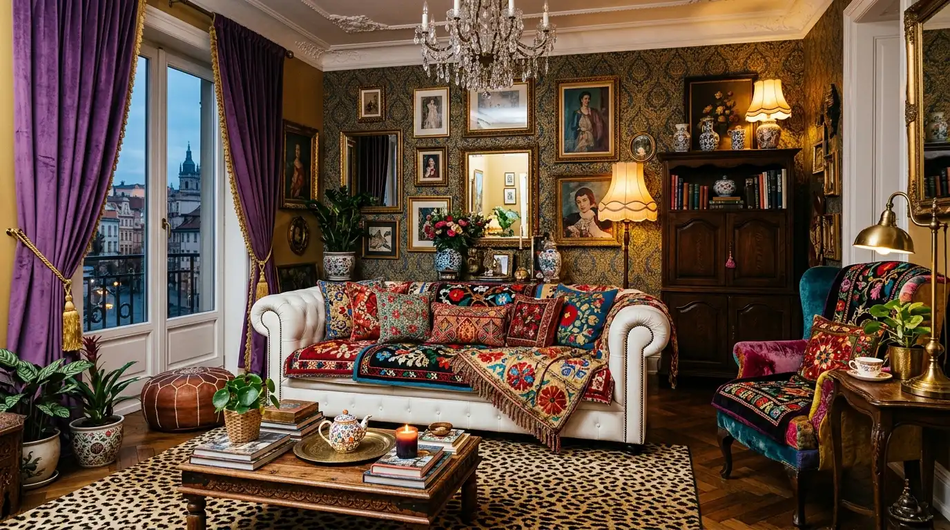 Maximalist living room white couch ideas utilize the most versatile piece of furniture as a “visual palette cleanser” within a dense, multi-layered environment. In a style defined by saturated colors and clashing patterns, a crisp white sofa acts as a sophisticated focal point that prevents the room from feeling overwhelming. By surrounding a cloud-like white linen or bouclé sectional with floor-to-ceiling galleries, neon accents, and botanical jungles, you create a high-contrast sanctuary where every surrounding treasure—from vintage rugs to lacquered ceilings—is allowed to shine with professional clarity.